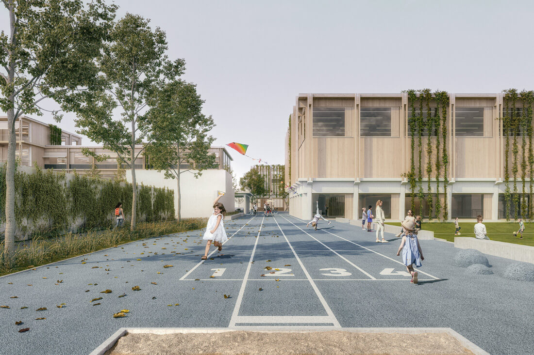 Das «Blaue Band» ersetzt den klassischen Hartplatz durch eine Multisportfläche, die Sport im Freien attraktiver macht und eine Vielzahl Aktivitäten anbietet. Als weitläufige Sportfläche schafft sie eine räumliche und funktionale Verbindung zwischen den Gebäuden, durch die Sport, Spiel und Schule nahtlos ineinander übergehen.